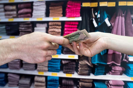 the buy buyers towels for the house and gives dollars to the seller. shopping concept