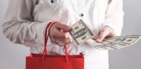 Girl holding dollar banknotes with a shopping bag. Shopping