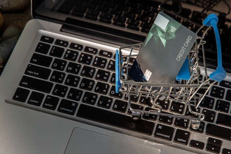 A credit card in a Mini supermarket trolley on a laptop keyboard. E-commerce and online shopping concept. Ideas about home shopping or buying things in virtual malls / stores from home or office by using modern technology called internet and web browser.