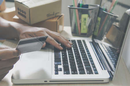 Man's hand holding credit card shopping online with computer. Business online concept. Vintage tone.
