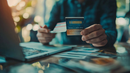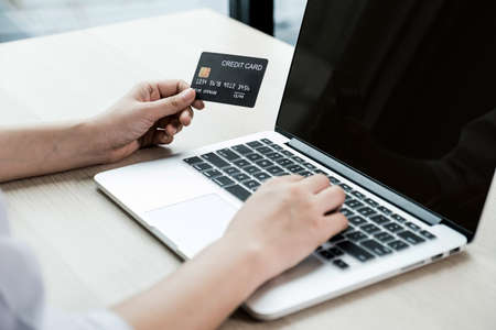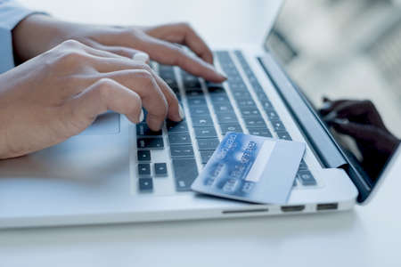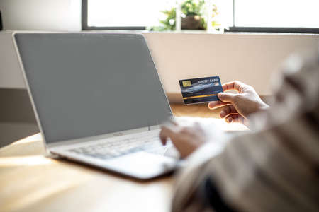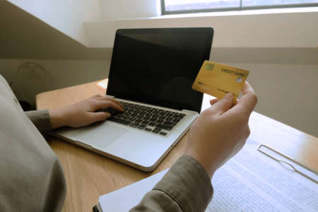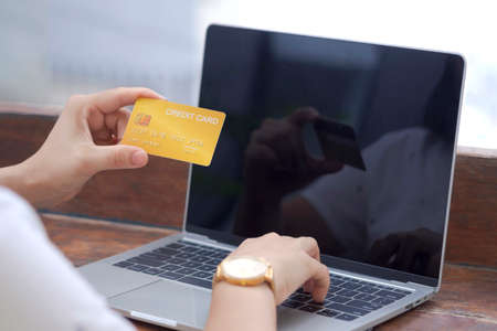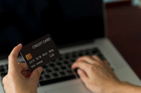 Man hand holding credit card using Internet technology digital to pay for his purchases and shopping online on a computer.