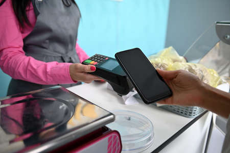 NFC contactless payment with electronic credit card in smartphone and via POS terminal. Focus on the customer's hand holding mobile phone and making contactless payment. Wireless technology concept