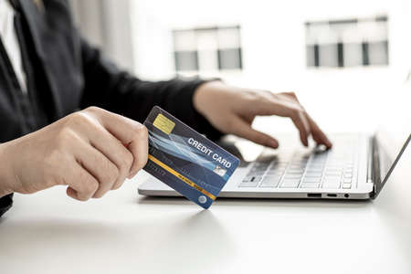 The businesswoman's hand is holding a credit card and using a laptop for online shopping and internet payment.