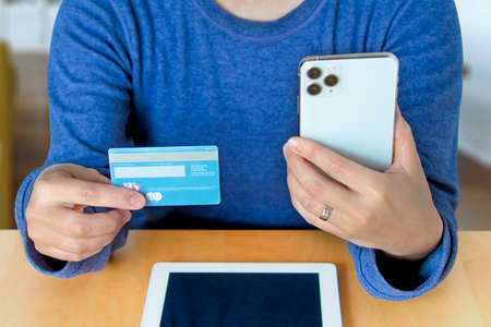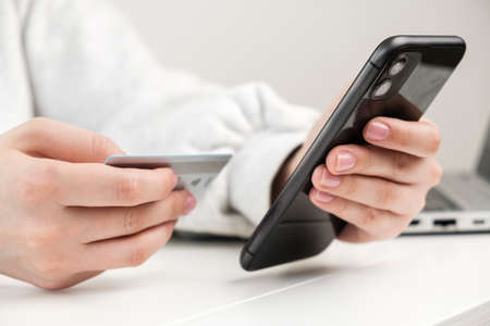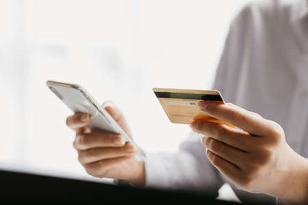 Hands holding credit card and smartphone for online payment for goods and services. Online payment and shopping concepts