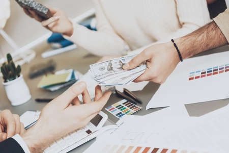 Two people are handing each other dollar bills, they are mutually beneficial business partners, they commit bribery fraud for business interests. The concept of corruption and bribery.