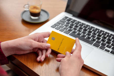 Bank credit card, Female hands holding blank yellow plastic card, online payment and shopping using computer laptop, close up view