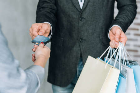 Shopping with credit card. Season store sale. Man with bags variety at checkout.