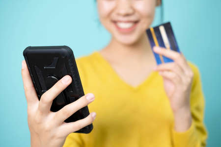 Girl holding a credit card to fill out on the smartphone To buy products online via the internet. Concept of spending money with modern technology