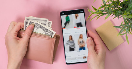 Payment for the purchase. Close up of one hundred dollar banknotes in female hands while paying for the purchase