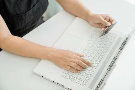 Close up woman hands holding credit card and using laptop shopping purchasing online. e-commerce, internet banking, checking balance, banking service, paying by credit card, making payment