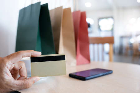 Select focus on hand holding credit card with shopping bags and mobile phone on table