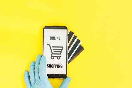 Close-up of hands in medical gloves with a smartphone. Online shopping, online banking, online payment. Payment with plastic cards. Flat Lay on a yellow background.