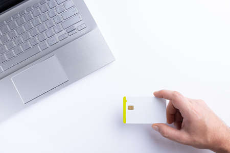 Hand holding credit card while paying online with laptop on white background. Top view with copy space.