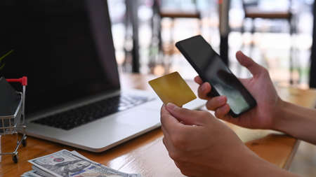 Closeup man hand holding smartphone and credit card making payment. Man doing shopping online on mobile phone.