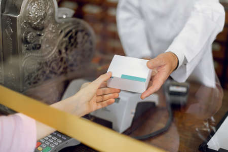 Medicine, pharmaceutics, health care and people concept. Cropped close up image of hands of male pharmacist giving white box with pills to woman customer at drugstore.