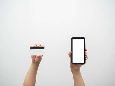 Hand holding credit card and mobile phone white screen isolated
