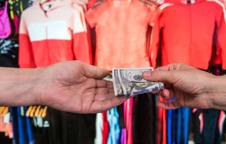 male hand holding dollar in clothing store for purchase. cash