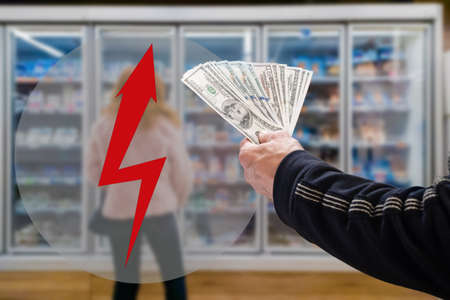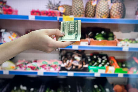 man holds dollars in the supermarket. purchase concept