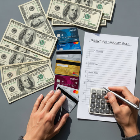 Woman in a maroon jacket counts a wad of cash at the supermarket checkout, a blur of brightly-colored grocery products in the background