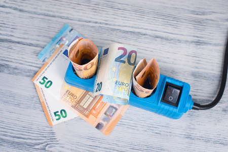 Euro banknotes in a power outlet, rising prices, expensive green electricity, Germany