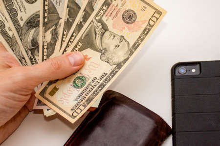 Hand holding US dollars various 50 banknotes with wallet and smartphone on a white background.