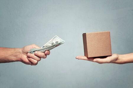 the buy buyers towels for the house and gives dollars to the seller. shopping concept