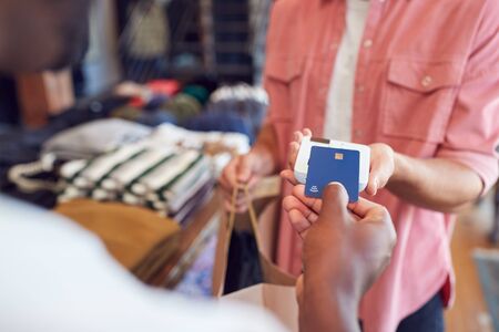 Man In Clothing Store Making Contactless Payment At Sales Desk Holding Credit Card To Reader