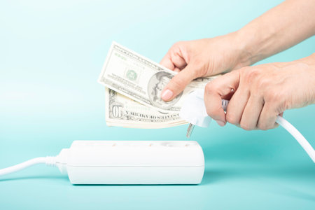 Woman hands holding electric power plug and US dollar banknotes near power strip extension cord on blue background. Electricity cost, electric prices increase, expensive energy concept