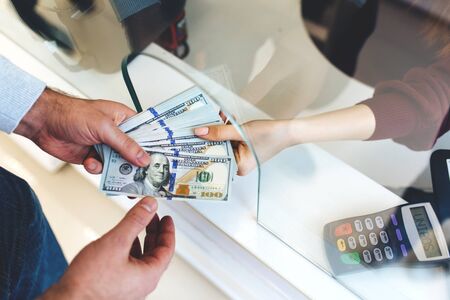 Payment for the purchase. Close up of one hundred dollar banknotes in female hands while paying for the purchase