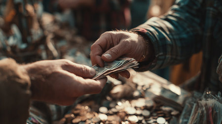 Two people are handing each other dollar bills, they are mutually beneficial business partners, they commit bribery fraud for business interests. The concept of corruption and bribery.