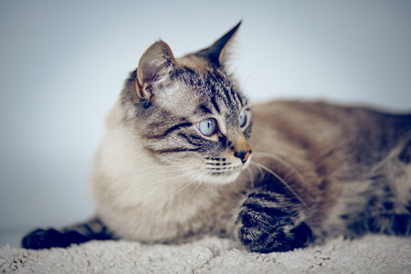 Portrait of a Thai tabby cat with blue eyes lying on a white carpet. A Thai-bred kitten with blue eyes.