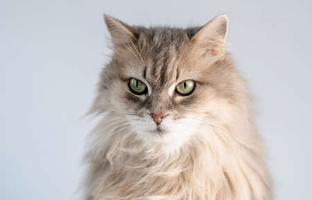 A close-up shot presents a grey cat with bright green eyes, set against a clean white backdrop. The cat's fur shows soft textures and subtle color gradients. The composition suggests a studio setting with even lighting. Suitable for a range of commercial applications like advertising or illustrative purposes.