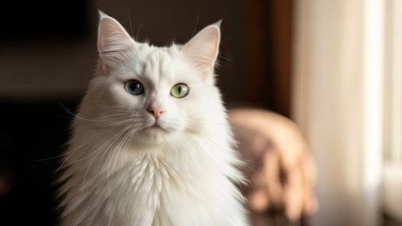 A close-up portrait showcases a fluffy white cat with one blue and one green eye. The cat is positioned in front of a window, bathed in soft, warm light. The image features a shallow depth of field, with the background slightly blurred. Suitable for various editorial and commercial applications.