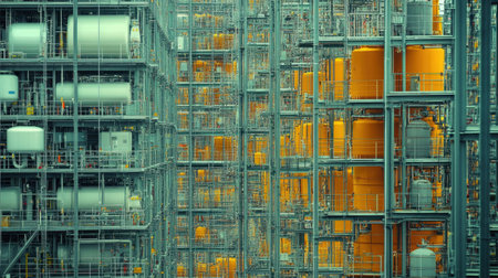 Large industrial plant featuring storage tanks, complex pipe systems, and processing equipment, highlighting industrial manufacturing and production processes