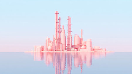 A sleek industrial facility highlights modern architecture and engineering with visible cooling towers and interconnected pipes, set against a pastel backdrop.