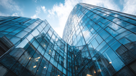 Modern glass building reflecting sky, corporate architecture, dynamic angle, daylight.