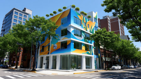 A vibrant urban building adorned with striking murals stands out against a bright blue sky, surrounded by lush trees and featuring modern architectural design.