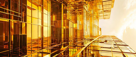 Golden glass skyscraper reflecting sunlight in modern cityscape
