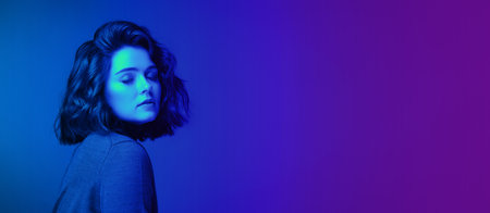Beautiful young woman with wavy hairstyle in neon light, space for text. Banner design