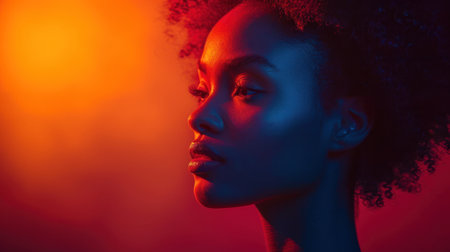 Headshot of gorgeous young stylish self-confident girl in colorful neon studio light. Creative woman beauty portrait.
