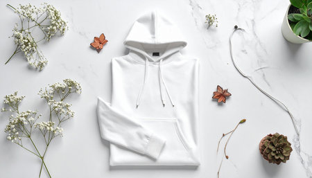 A white hoodie lies flat on a marble surface, surrounded by delicate white flowers and decorative elements.