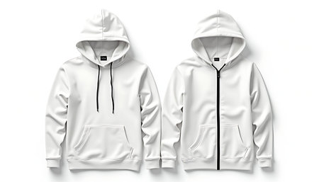 Two blank white hoodies, one with a zipper and the other without, are displayed on a white background with soft lighting and studio aesthetic, ideal for clothing design mockups.