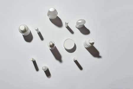 Top view of many different white tubes and bottles for hygiene, health and beauty isolated over white background with reflection