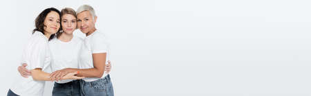 Cheerful women in white t-shirts hugging isolated on grey, banner