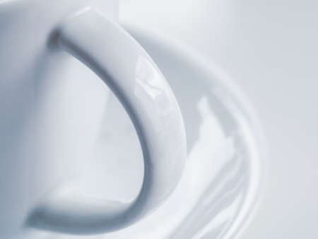 A realistic coffee cup rests on the left side of a simple white background, creating a clean and minimal design.