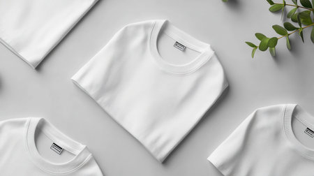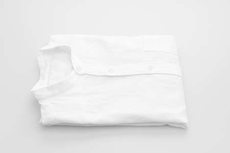 Blank white t shirt, top view. Folded t-shirt on a gray background
