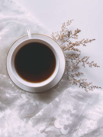 Coffee cup with white snapdragon flowers on white background. flat lay, top view, copy space