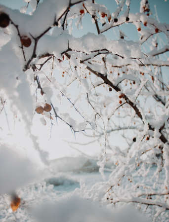 Snowy frost bush branches winter background. Selective focus, blurred background