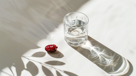 Aesthetic light background with glass of water and dry dates. Iftar time. Muslims and Ramadan concept. Generative AI.