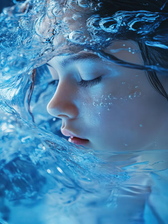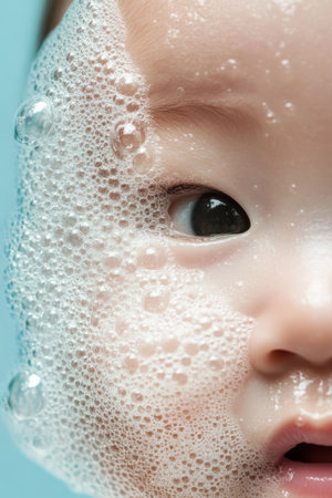 This close-up image captures the serene expression of a person with soapy bubbles on their face, highlighting freshness and relaxation.
